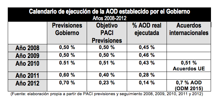 A partir de entonces, la AOD se convierte en víctima de unos recortes presupuestarios que toman fuerza en mucha mayor medida que otras partidas. Así, para el año 2010 la AOD desciende hasta el 0,43%, cuando la UE aprobó que sus países miembros destinaran el 0,51% de AOD, para descender al año siguiente al 0,28%, y caer bruscamente hasta el 0,14% ya durante el primer año de mandato del Partido Popular. Esta cifra significa la más baja en la historia de la cooperación española y una de las más reducidas entre los donantes mundiales. Ese es el punto al que este Gobierno del PP ha llevado a la política de cooperación al desarrollo en tan solo un año, reduciéndola a la mínima expresión. Y los Presupuestos Generales del Estado para este año apuntan que la AOD seguirá en caída libre, llegando a un exiguo 0,07%.