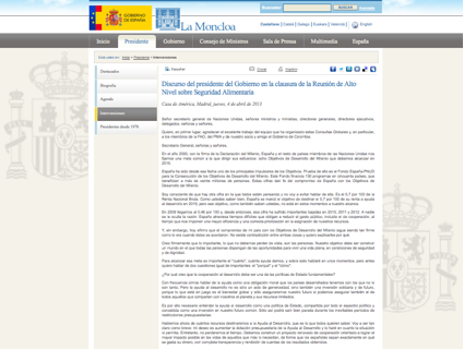 El pasado día 4 de abril de 2013 se celebró en Madrid la Reunión de Alto Nivel sobre Hambre, Seguridad Alimentaria y Nutrición liderada por España, el Gobierno de Colombia y los organismos de Naciones Unidas, FAO y PMA. El encuentro, inaugurado por el Ministro de Asuntos Exteriores y Cooperación, José Manuel García-Margallo, contó con la participación de 32 países, organizaciones de la sociedad civil y las principales agencias de Naciones Unidas, entre las cuales cabe destacar el papel de la FAO (Organización de Naciones Unidas para la Alimentación y la Agricultura), PMA (Programa Mundial de Alimentos), FIDA (Fondo Internacional para el Desarrollo Agrícola) y PNUD (Programa de Naciones Unidas para el Desarrollo). Junto al discurso del Secretario General de Naciones Unidas, Ban Ki-moon, el Presidente del Gobierno español, Mariano Rajoy, pronunció el discurso de clausura.