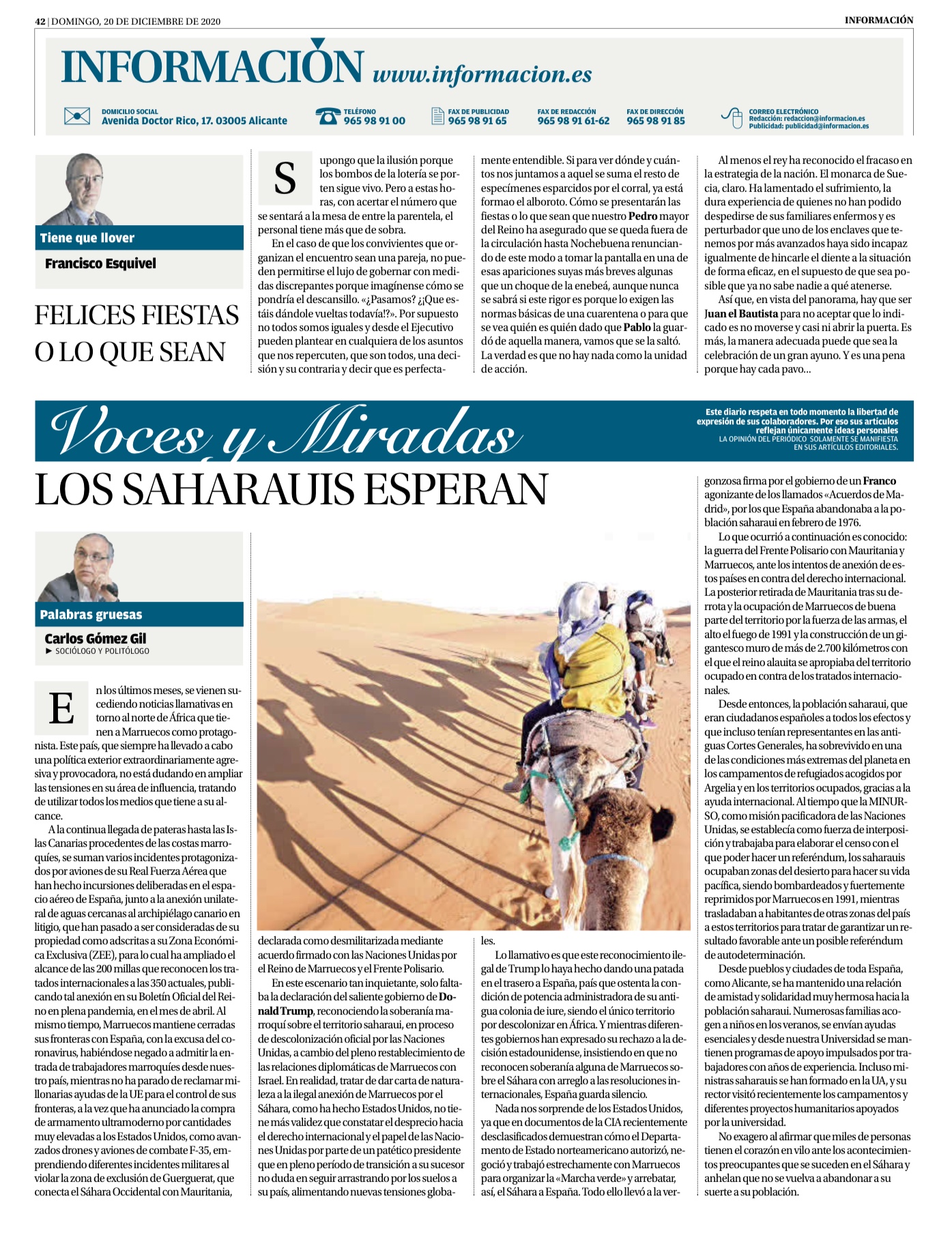 En este escenario tan inquietante, solo faltaba la declaración del saliente gobierno de Donald Trump, reconociendo la soberanía marroquí sobre el territorio saharaui, en proceso de descolonización oficial por las Naciones Unidas, a cambio del pleno restablecimiento de las relaciones diplomáticas de Marruecos con Israel. En realidad, tratar de dar carta de naturaleza a la ilegal anexión de Marruecos por el Sáhara, como ha hecho Estados Unidos, no tiene más validez que constatar el desprecio hacia el derecho internacional y el papel de las Naciones Unidas por parte de un patético presidente que en pleno período de transición a su sucesor no duda en seguir arrastrando por los suelos a su país, alimentando nuevas tensiones globales.