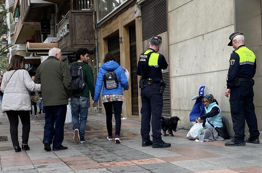 En la fotografía captada por Carolina Pascual que ocupaba la portada del ejemplar de Información del pasado domingo, y que ha recorrido el país de punta a punta, dos policías municipales están sancionando a una mujer sentada en el suelo recostada contra la pared en una céntrica avenida de la capital. Las ropas y el carro azul a su lado delatan su condición vulnerable, estando acompañada por un dócil perrillo negro como única compañía. A su vez, las personas que caminan y contemplan la escena, miran con una mezcla de asombro y curiosidad. Como se informaba en la noticia, la mujer recibió el acta de denuncia con absoluta corrección, siendo requerida a que se marchara, obedeciendo de inmediato y saludando amablemente a los policías que le entregaban la notificación. El alcalde, Luis Barcala, había puesto en marcha la ordenanza de la vergüenza, que entró en vigor hace un mes, incoando la primera multa a una mujer que mendigaba, sin ejercer coacción ni molestar a los transeúntes.