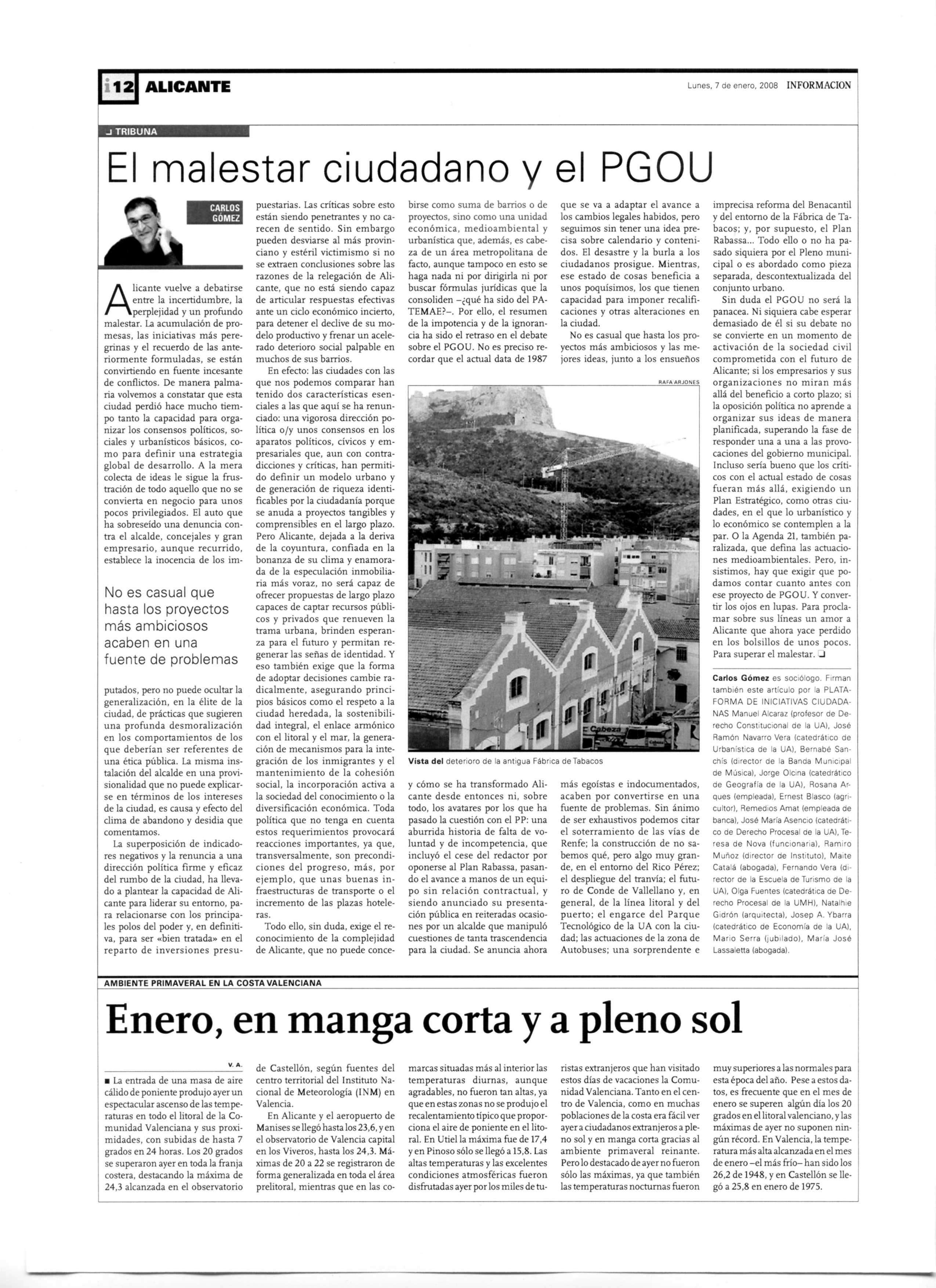 El malestar ciudadano y el PGOU, Carlos Gómez Gil, 07/01/2008